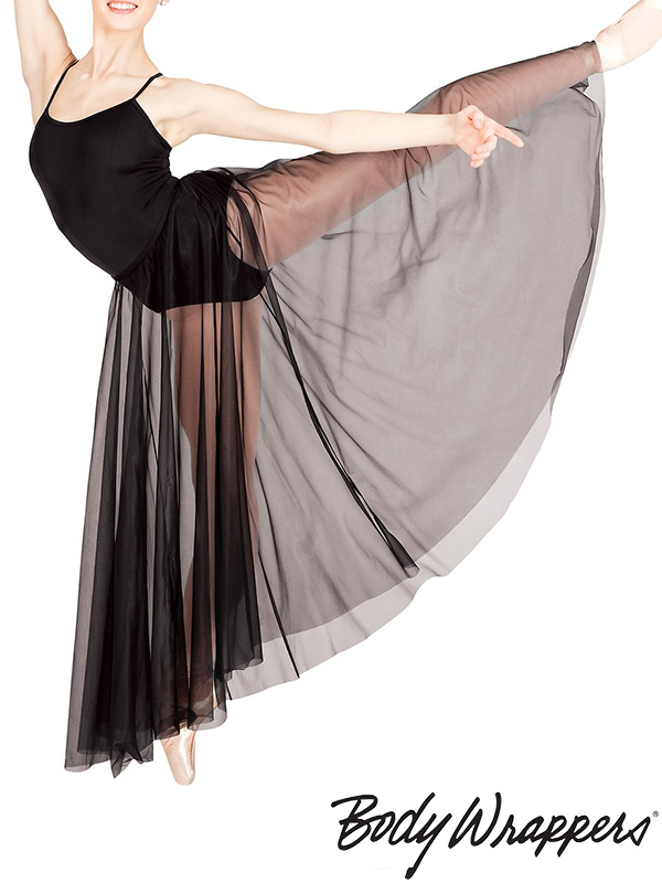 Full chiffon skirt features a narrow matching exposed elastic waistband.